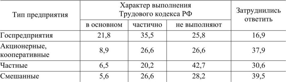 Степень выполнения Трудового кодекса РФ на различных типах предприятий