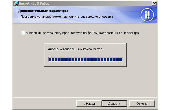 7. При установке на ОС Windows 2000/ХР нужно определить необходимость замены установленных по умолчанию прав доступа пользователей к основным ресурсам компьютера. Сохраняем отметку в поле «выполнить расстановку прав доступа на файлы, каталоги и ключи реестра».
