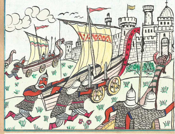 Поставив ладьи на колеса, Олег по суху со своим флотом подошел к началу бухты с намерением спустить ладьи в бухту и вплыть в центр города. Греки, устрашенные сим маневром, поспешили предложить мир и дань. В знак победы Олег повесил свой щит на врата Царьграда.