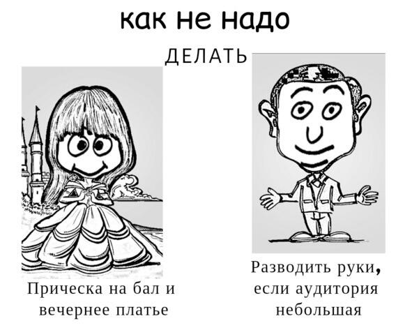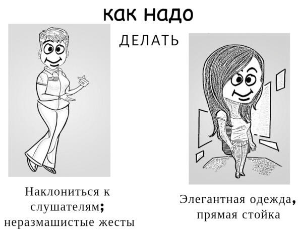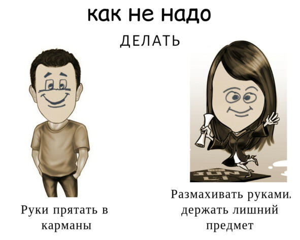 КАК не надо делать: руки складывать на груди, прятать за спиной, одной рукой прижимать другую, в руках держать предмет, когда им не пользуются, жестикулировать руками, как при пожаре, перескакивать с ноги на ногу, карманы набивать разными предметами, показывать пристальный взгляд с серьезным выражением (словно вы за всеми следите, и никто от вашего взгляда не уйдет) и монотонно произносить речь (см. Рисунок 2.18).