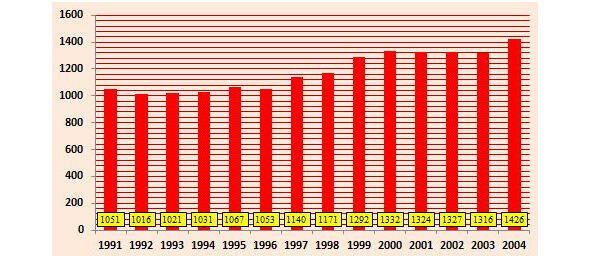 Рисунок 17. Рост общей заболеваемости в Санкт-Петербурге с 1991 по 2004 г. Данные отчета о работе Комитета по здравоохранению Санкт-Петербурга за 2004 г.