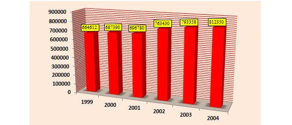 Рисунок 18. Абсолютное число лиц, поступивших в ЛПУ системы Комитета по здравоохранению в 19992004 г. Данные отчета о работе Комитета по здравоохранению Санкт-Петербурга за 2004 г.