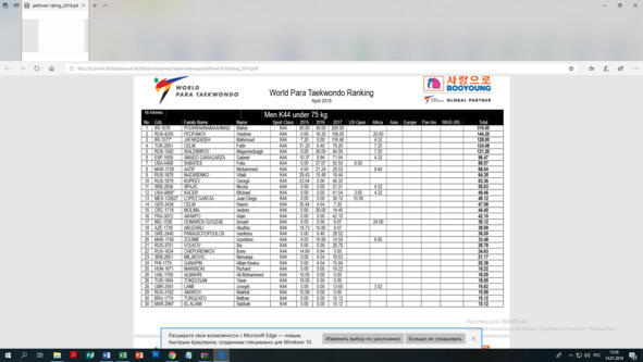 Рисунок 1 Мировой рейтинг спортсменов паратхэквондистов в разделе К-44 в в/к до 75 кг на 2018 год