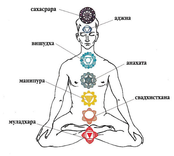 1. Чакра Муладхара. Эта чакра расположена в области копчика и на физическом плане ей соответствует крестцовое нервное сплетение. Чакра имеет четыре энергетических лепестка; её цвет красный. В этой чакре сходятся энергии Иды и Пингалы. Здесь же начинается канал Сушумна. В соответствии с цветом, Муладхара работает в диапазоне низких частот, поэтому её энергия используется в простейших случаях, для выполнения вегетативных функций и физической работы. Чакра имеет непосредственное отношение к инстинкту самосохранения.