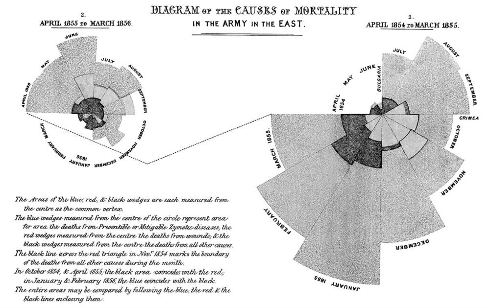 Круговая диаграмма о количестве смертей в Крымской войне, которую подготовила сестра милосердия и общественная деятельница Великобритании Фроленс Найтингейл. В своих трудах она впервые использовала круговые диаграммы, тем самым став их изобретателем. Она подготовила эти диаграммы, чтобы показать, сколько смертей можно было избежать, если заниматься профилактикой и лечением заболеваний раненных солдат, которые подвергались двойному риску с попаданием в госпитали. На рисунке выделен размер смертности, который наступал от болезней или инфекций уже в госпиталях, куда попадали раненые солдаты. Диаграмма сестры Найтингейл конкретна, наглядна и имеет четкий «call to action», но она не идеальна, как утверждает журнал Economist. Так, каждый из цветных клиньев измеряется из центра, поэтому частично закрывает друг друга (вот только эта книга черно-белая, поэтому советую найти диаграмму в Интернете). В дополнении число смертей не указано, хотя это был относительный размер. Но даже несмотря на это, данная инфографика была включена в отчет комиссии по проблемам здоровья в армии, и оказала положительное воздействие на принимаемые решения.