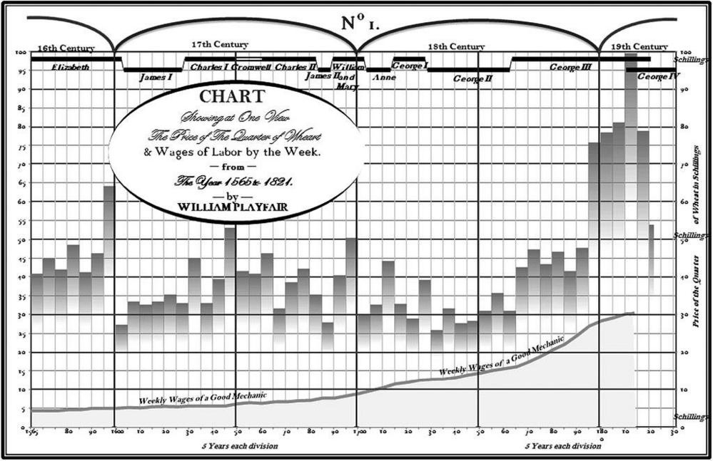 Один из самых известных его графиков отражает еженедельную заработную плату хорошего механика. Этим графиком он пытался пояснить связь себестоимости пшеницы и стоимости механистического труда. Один из выводов графика: стоимость пшеницы сегодня стала несоизмеримо мала с переходом к механистическому труду. Использование Плейфэром горизонтальной и вертикальной осей для представления времени и денег стало новшеством для того времени. Он был первым, кто использовал данные не только для того, чтобы информировать, но и для того, чтобы убеждать принимать решения и проводить кампании.