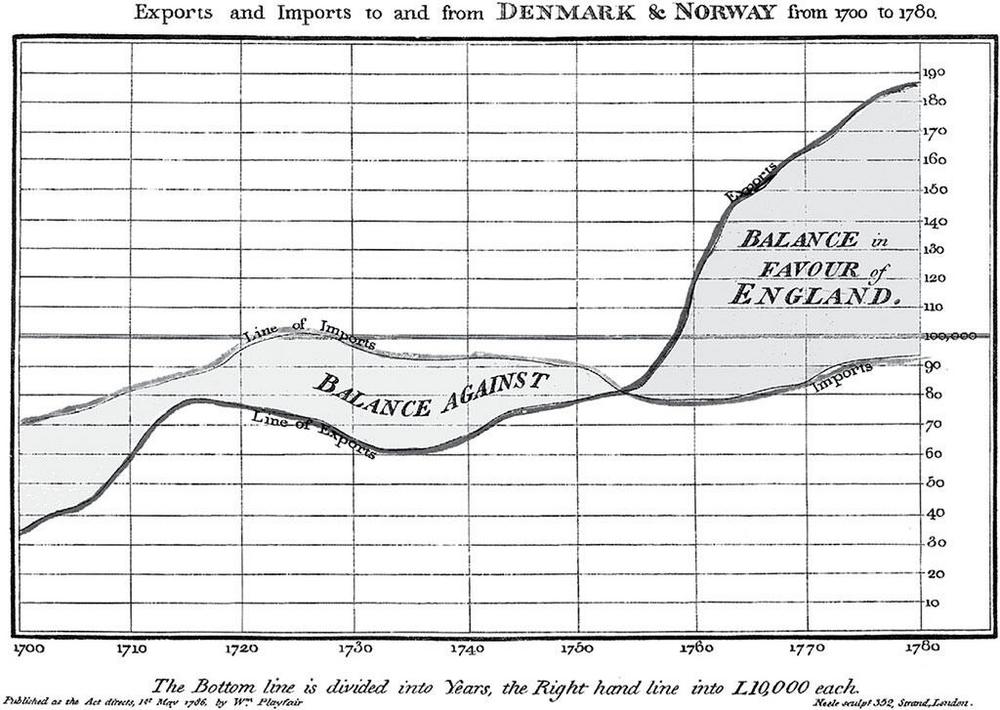 Экономические диаграммы и чарты шотландского инженера и основателя графических методов статистики Уильяма Плейфэра. Плейфэр изобрел линейчатый график и гистограммы для представления данных. Ряд его диаграмм отражает торговый баланс для Англии. Он был первым, кто показал размеры и экспорт на одном графике, сформулировав тезис о влиянии сдвига торгового баланса на уровень развития той или иной страны.