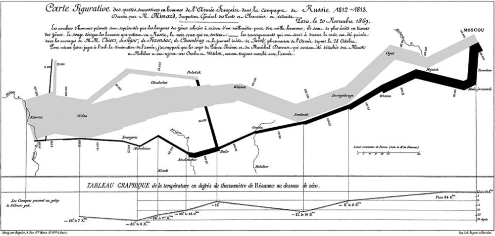 Картографическая визуализация о вторжении Наполеона в Россию, 29 ноября 1869, подготовленная Шарлем Жозефом Минаром, французским инженером, топографом и автором проектов портов и каналов. Карта включала в себя 6 (!) различных видов данных: