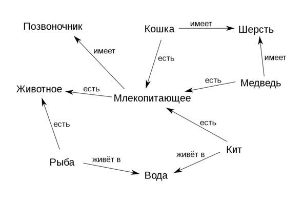 Рис. 1. Элементы семантической сети представлены в виде ориентированного графа, вершины которого обозначают объекты предметной области, а ребра между ними формируют отношения между ними.
