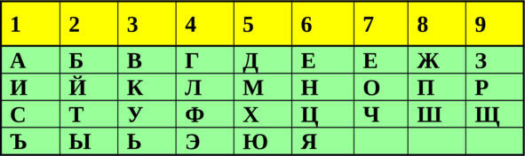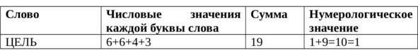 И начнём мы с самого главного слово «цель». Рассчитаем это слово, опираясь на русский алфавит. Ниже представлена таблица, в которой каждой букве соответствует числовое значение.