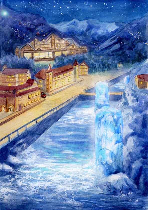 Подошли к небольшому деревянному мостику, который перекинут через маленькую речушку. Тишину нарушало только журчание воды. Ледяные скульптуры с необычной подсветкой словно растут из реки, кажется, вот-вот они начнут двигаться, добавляя сказочности Ортизеям. Живописнейшее место, созданное природой и людьми, дух захватывает! Только картины или стихи здесь писать. Идем дальше к центру деревни, все в снегу и ночной подсветке, современные бутики и бары, вырезанные вручную деревянные скульптуры почти на каждом углу.