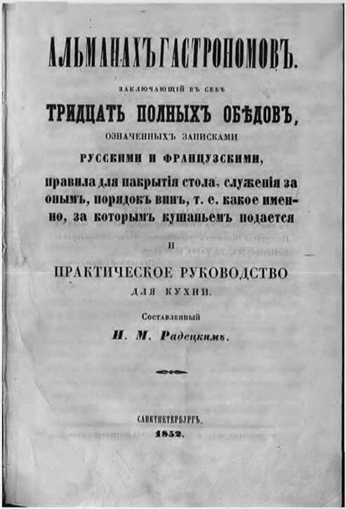 Три тома «Альманаха гастрономов» Игнатия Радецкого вышли в 18521855 годах в Санкт-Петербурге. Им также были выпущены книги «Хозяйка, или Полнейшее руководство к сокращению домашних расходов» и «С.-Петербургская кухня» (1862)