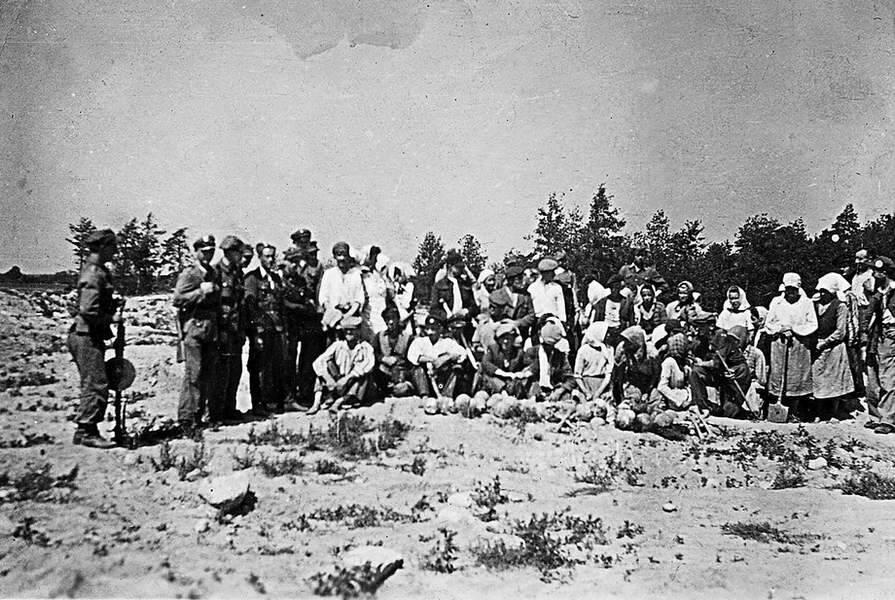 Сделанный вскоре после окончания Второй мировой войны, в середине XX в., снимок представляет групповую сцену где-то в центре Европы. На фотографии рядом с группой мазовецких крестьян увековечен холм из праха 800 тыс. евреев, убитых в газовых камерах или сожженных в Треблинке с июля 1942 по октябрь 1943 г. Европейцы, которых мы видим на снимке, по-видимому, занимались раскапыванием человеческих останков в поисках золота и драгоценностей, которые проглядели нацистские убийцы: это кропотливое занятие, так как, по рассказам палачей, они скрупулезно заглядывали еврейским трупам во все отверстия тела и вырывали золотые зубы.