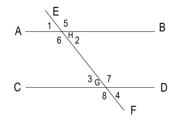 Угол 5 можно обозначить как EHB или BHE. Угол 2 можно обозначить как BHG или GHB. Угол 6 можно обозначить как AHG или GHA. Угол 8 может быть обозначен как CGF или FGC и так далее.