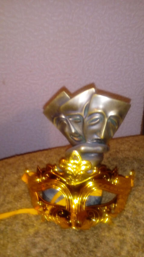 В фойе странный субъект метался от посетителя к посетителю предлагая купить золотистые и серебристые театральные маски.