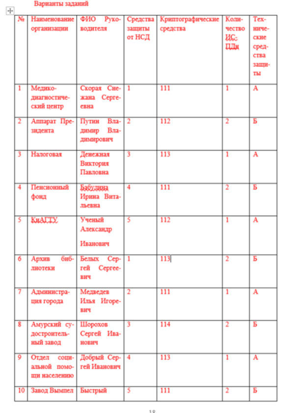 Ко второй неделе необходимо подготовить уведомление об обработке персональных данных. Пример уведомления приведен в книге далее, к 5-ой неделе комплект документов в соответствии со спецификацией приведенной далее для Роскомнадзора, к 10 неделе комплект документов в соответствии со спецификацией приведенной далее для ФСТЭК, к 15 неделе комплект документов в соответствии со спецификацией приведенной в далее для ФСБ. В каждом варианте обязательно в организации обеспечением информационной безопасности которой занимается студент ведется автоматизированная обработка более чем 100 000 субъектов персональных данных. Обязательно есть необходимость использовать технические средства защиты информации от утечек по техническим каналам, средства защиты от несанкционированного доступа, средства криптографической защиты информации. Ответственным за обеспечение информационной безопасности в организации назначается студент. Нужно учесть, что если количество ИСПДн в организации больше одной, то некоторые документы представляются по каждой ИСПДн в отдельности. Спецификации подаваемых документов подлежат обязательному согласованию с преподавателем.