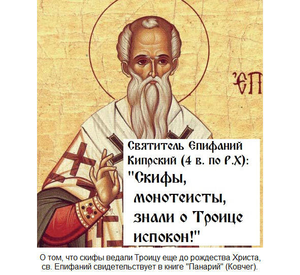 Скифам же, большинству из них, не требовалось и переходить из одной веры в другую, принимая крещение во имя Христа. Скифство (духовная Традиция древних руссов, северный ведизм, чин Мелхиседеков) как раз и представляло собой протохристианство (подробней в книге «Единство Троицы»). Раннехристианские святые отцы сознавали вполне сей духовный факт, искусственно «забываемый» веками последующими. Так, например, Епифаний Кипрский свидетельствовал в книге «Панарий»: