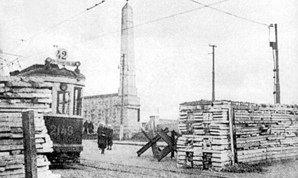 Трамвай 42 движется по Бородинскому мосту к Смоленской улице от Киевского вокзала. 1941 г.