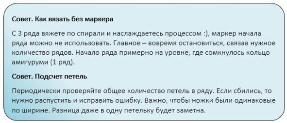 Голова, туловище и ноги вяжутся как одна деталь. Вязать куколку начнем снизу-вверх вначале ножки, затем туловище и закончим деталь головой.