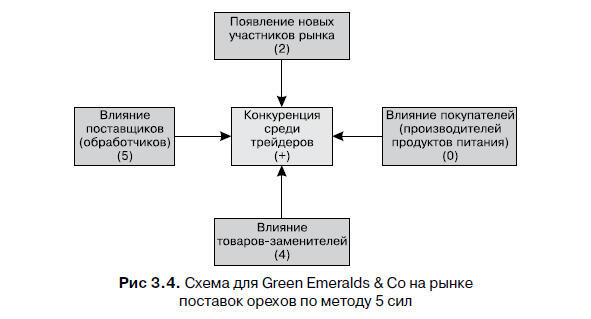 Для данного примера новые участники рынка орехов могут появиться из категории «трейдеров другого товара», например трейдеров сахарного песка или какао-продуктов. Если эти компании примут решение о вхождении в новый для них рынок, это может оказать очень сильное влияние на положение существующих игроков. Причиной тому является хорошее знание ими рынка и покупателей (по сути, покупателями для них будут являться те же самые кондитерские производства). Кроме того, эти трейдеры уже имеют известный в пищевой отрасли бренд и, вероятно, располагают достаточными денежными средствами для подобных интервенций на смежные рынки. Однако на практике подобное поведение со стороны трейдеров редкость, поскольку каждая компания обычно имеет какую-то специализацию и, используя свою ключевую компетенцию, следует ранее избранной стратегии.