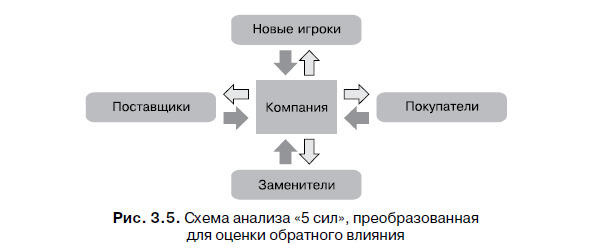 С этой точки зрения можно модифицировать модель Портера, сделав ее практически более значимой. Для этого необходимо на схеме отобразить разнонаправленные стрелки, отражающие возможности компании по нейтрализации воздействия на нее, и точно также расставить оценку степени обратного влияния (рис. 3.5).