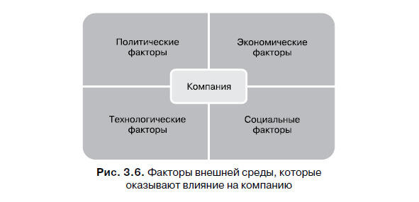 Помимо рассмотренных факторов основных параметров рынка, существуют факторы, характеризующие внешнююсреду в целом, например покупательские предпочтения или уровень инфляции в стране. Эти факторы действуют не только на вашу компанию, они оказывают влияние на все компании находящиеся в одной отрасли. Чтобы учесть возможное влияние различных факторов внешнего окружения, следует использовать PEST-анализ, при котором они разделяются на четыре основные категории: