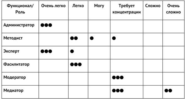 В таблице представлены роли (набор функций) модератора и самооценка участников трека о том, насколько им легко/сложно даётся их выполнение в групповой работе (пиковые значения).