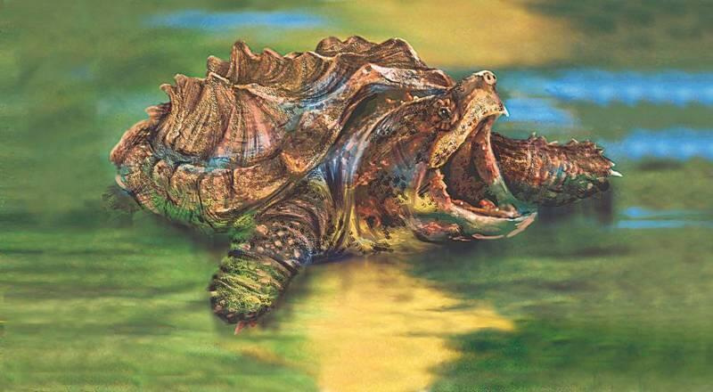 Грифовая черепаха самая крупная из пресноводных черепах, длина ее панциря достигает 7080 см, а весит она 7090 кг. Обитает она в болотах и озерах на юго-востоке США. Относится она к древнему семейству каймановых (кусающихся) черепах. В США ее называют аллигаторовой кусающейся черепахой. У грифовой, как и у каймановой, черепахи очень маленький крестообразный пластрон, связанный с карапаксом узкой перемычкой; пластрон почти не закрывает мягкие части тела. Обе черепахи этого семейства имеют очень вкусное мясо и поэтому являются предметом охоты местного населения. Грифовая черепаха довольно всеядна, но в основном питается рыбой. Эта черепаха «засадница», то есть охотится, подстерегая добычу. Карапакс ее быстро зарастает водорослями, и лежащая на дне черепаха очень похожа на камень. На языке у нее находится придаток, формой и цветом похожий на земляного червя. Лежа на дне, грифовая черепаха открывает рот, шевелит червеобразным придатком и ждет, когда заинтересовавшаяся рыба приплывет ей в рот. Тогда черепаха мгновенно закрывает рот, захватывая рыбу.