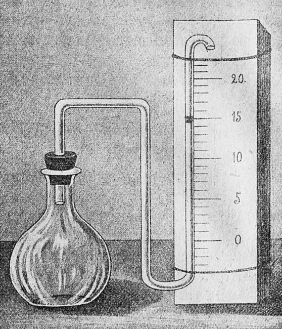 Вы сами можете устроить градусник, только не ртутный, а воздушный. Устройте его так, как изображено на рисунке. Для этого вам придется достать очень маленький стеклянный пузырек с тонкими стенками и длинную стеклянную трубку. Эту трубку можно согнуть, сильно разогрев ее (от нагревания стекло делается мягким). Согните ее в два колена, как показано на рисунке. Просуньте короткий конец согнутой трубки через отверстие в пробке пузырька, а длинный конец привяжите к дощечке с делениями. Прежде чем запереть пузырек пробкой с трубкой, впустите в нее каплю масла. Если вы будете осторожно дуть в тот или другой конец трубки, то можете заставить каплю остановиться как раз посередине длинного колена трубки. Теперь все готово!.. Закупорьте пузырек плотнее пробкой, в которую вставлен кончик трубки, и залейте эту пробку воском. Когда в комнате станет теплее, воздух в пузырьке расширится и погонит каплю масла кверху; если же станет холоднее, то воздух сожмется, и капелька масла опустится.