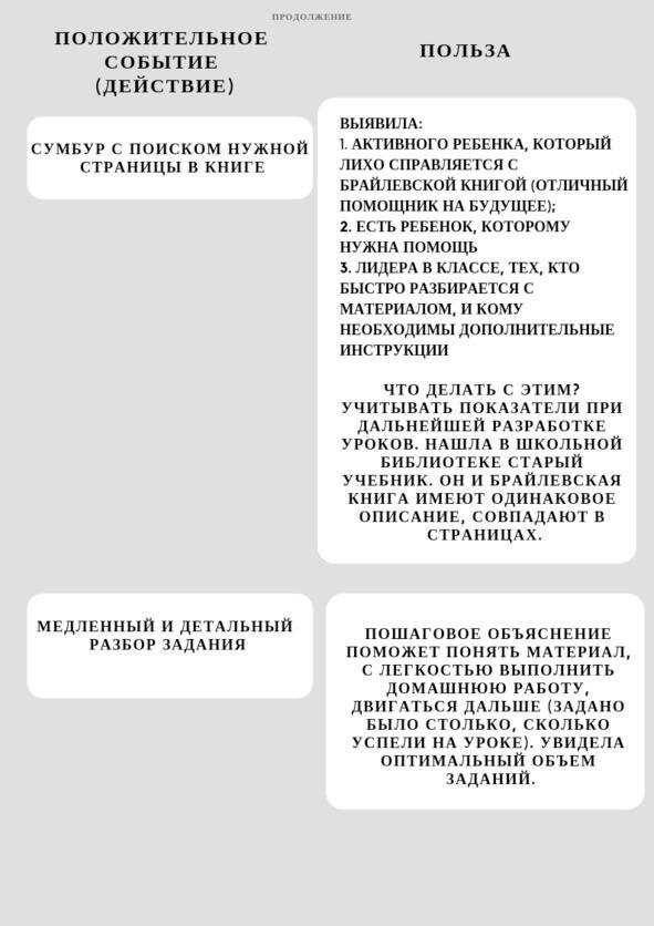разработала карточки с заданиями, подручными средствами работы для слепых детей, чтобы они смогли вместе с остальными участвовать на равных условиях;