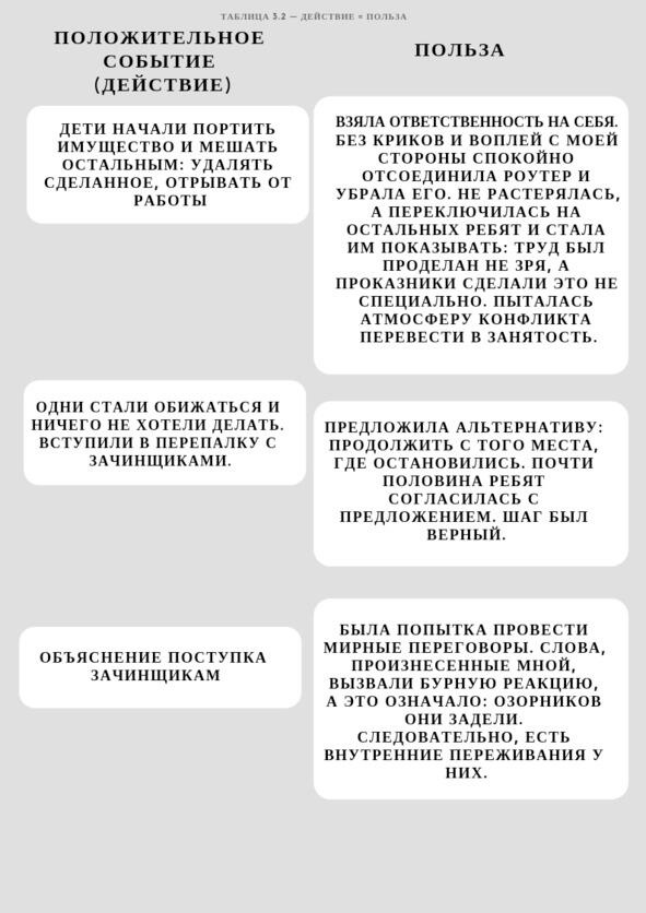 Ученики меня слушали вполуха, так как были «на эмоциях». Большая часть все-таки меня поняла. Другие ребята стали расстраиваться, перестали выполнять задания, а вместо этого кричали на зачинщиков. Я стала дальше беседовать с оставшейся командой недовольных. Сообщила: «Я уверена: отлично поработали и сможете потом повторить действия при необходимости». Некоторые из ребят согласились. Трое продолжили возмущаться.