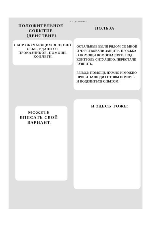 После этого отметьте положительные моменты. Найдите в своей истории пользу и украсьте ее. Зафиксируйте ниже.