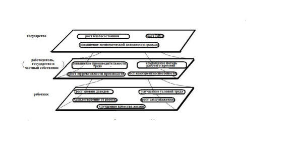 Изложенные выше экономические проблемы являются общими как для социалистической экономики, так и капиталистической и показывают, что для их разрешения нужны неординарные решения. Такими решениями могут быть новые принципы инвестиции в человеческий капитал. Кто же в таком случае должен быть инвестором? Как известно инвестирование предполагает вложение средств во что-то с целью получения некой выгоды. Инвестирование в человеческий капитал преследует получение для инвестора каких-то выгод как для себя непосредственно, так и для третьих лиц. Так, для работника это повышение уровня доходов, удовлетворение от работы, улучшение условий труда, рост самоуважения, улучшение качества жизни. Для работодателя (государства или бизнеса) это повышение производительности труда, сокращение потерь рабочего времени и рост эффективности производства, что в конечном итоге способствует повышению конкурентоспособности фирмы. Для государства это повышение благосостояния граждан, рост валового дохода, повышение экономической активности граждан. В этом проявляется иерархия выгод: для работника, для работодателя государства и бизнеса и для государства в целом. Причем каждая из этих выгод расположена как бы в одной плоскости на своем уровне (рисунок 1).