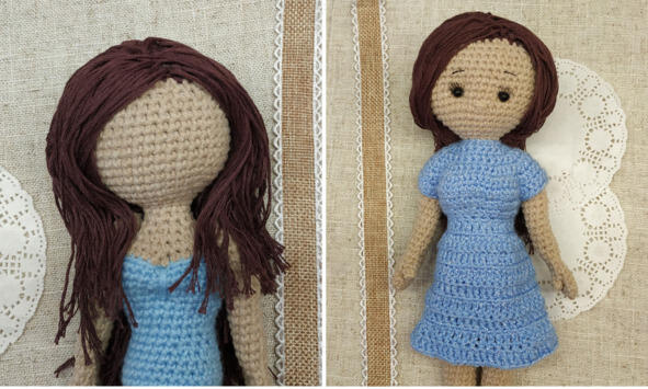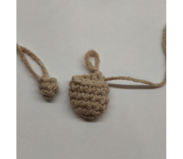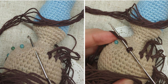 3. Ниточку сложить пополам. Крючок ввести в головку по линии, намеченной иголочками. Захватить ниточку и протянуть через головку. Затем в петельку на крючке продеть кончики ниточек. Затянуть получится «узелок» как справа на фото.