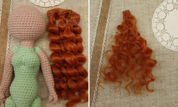 Первый ряд. Тресс приложить сзади по нижней части головы, примерно от ушка к ушку. Тресс обрезать и пришить к голове. Я шью швом «назад иголка» и использую простые нитки под цвет волос.