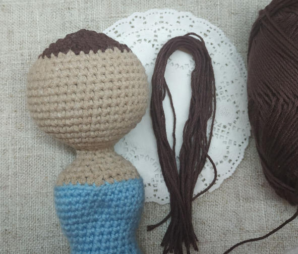 Кончик тресса скрутить рулончиком, по мере скручивания сшивать края (швом «через край»). Сделать рулончик диаметром 12 см. Кончик тресса обрезать. Рулончик пока отложить, пришивать его будем на макушку в самом конце.