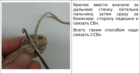 6 ряд. Начало ряда у основания пальчика. Убавка, 2 Сбн (по пальцу), Убавка (основание пальца), 6 Сбн (по ладошке) = 10 п.