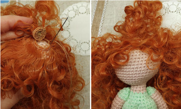 Рулончик приложить к дырочке (макушке) и пришить. В итоге на макушке получится «фонтанчик».