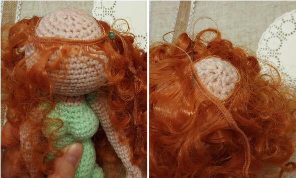 Четвертый и последующие ряды. С 4 ряда пришивать ряды вкруговую, плотно друг к другу. Если тресса не хватает, то сзади я оставляю небольшое расстояние между рядами. Впереди (на лобике) обязательно плотно, ряд к ряду. На макушке все ряды плотно друг к другу. Шить вкруговую до тех пор, пока не останется дырочка диаметром с рулончик (который делали в самом начале).
