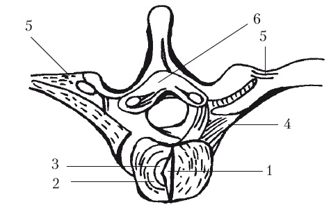1 межпозвоночный диск; 2 фиброзное кольцо диска; 3 студенистое ядро диска; 4 сустав головки ребра; 5 реберно-поперечный сустав; 6 желтая связка