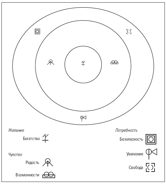 Я создал разновидность мандалы сигилов трехчастную мандалу, которая особенно полезна для осуществления сложных изменений, вызывающих у нас неосознанное сопротивление. Как я уже говорил, семиотическая теория магии подразумевает, что наши текущие семиотические коды обладают определенным преимуществом в интерпретации, что и заставляет нас их придерживаться. Чтобы изменить эти коды, нужно осознать их существование и поработать с ними, либо предусмотрев для них какое-то новое применение, либо признав, что они являются помехами. Трехчастная мандала сигилов предполагает работу с тремя факторами, которые я считаю важными для мотивации людей: желанием, чувством и потребностью. Центр мандалы используется для выражения желания человека посредством сигилов или каких-либо еще символов. Среднее кольцо символизирует позитивные чувства, которые вызовет исполнение данного желания, а внешнее потребность, на удовлетворение которой направлено желание (см. рис. 1). Важно помнить, что следует фокусироваться на позитивных чувствах и личных потребностях. Например, если я ворожу на богатство, то могу предугадать, что получение денег заставит меня беспокоиться о вариантах их вложения. Беспокойство это не позитивная эмоция, а вот радость от обретения новых возможностей позитивная. Я сигилизирую «радость» или «возможности» вместо «беспокойства». А также осознаю, что богатство удовлетворит мои потребности в безопасности, уважении и свободе. Кроме того, оно даст возможность заботиться о своей семье но это уже потребности других людей, а я работаю над своим собственным сознанием[15].