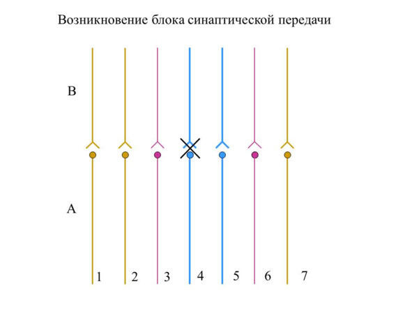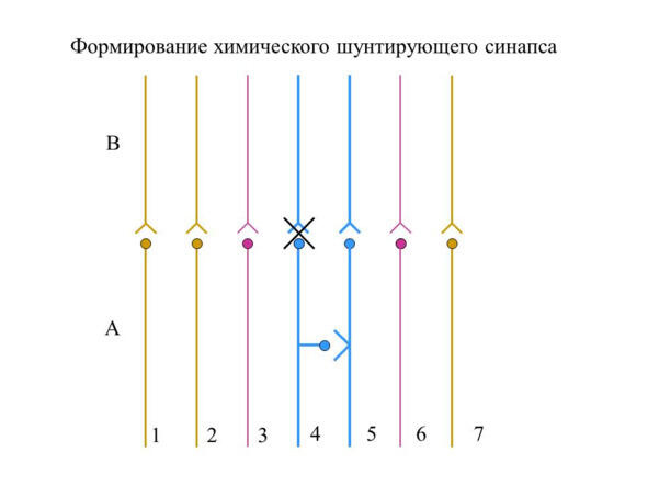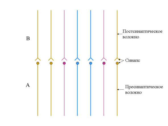И затем, со временем, этот участок преобразуется в химический синапс. Теперь уже сигналы от рецепторов будут уходить по новому синапсу, а исходный (врожденный, физиологичный) остается без работы.