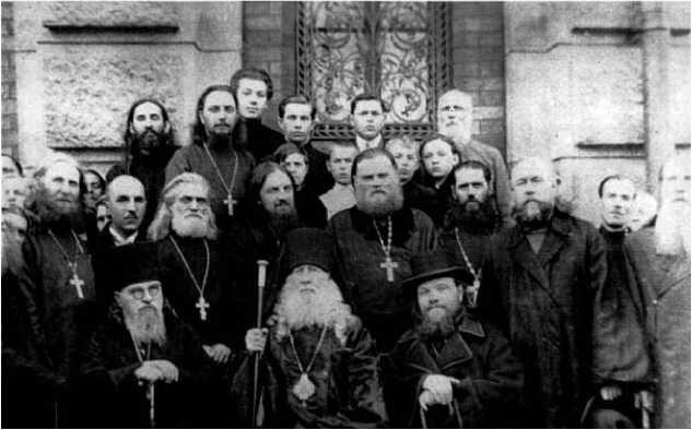 Иосифлянские священнослужители и миряне у храма Воскресения Христова (Спас на Крови). Лето 1929 г. Сидят (слева направо): еп. Сергий (Дружинин), архиеп. Димитрий (Любимов), прот. Василий Верюжский. Стоят (1-й ряд, в центре): прот. Никифор Стрельников, Н. Шенец, прот. Иоанн Быстряков, прот. Викторин Добронравов, архим. Клавдий (Савинский), прот. Александр Советов, протодиакон Иоанн Предтеченский. Стоят (2-й ряд): протодиакон Михаил Яковлев, свящ. Филофей Поляков, псаломщик Андрей Карцев, иподиакон Петр Сазонов, иподиакон Адриан [?]