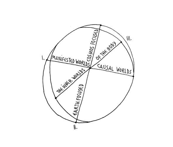 1. Каузальный мир (мир причин) сзади, проявленный мир (мир следствий) спереди