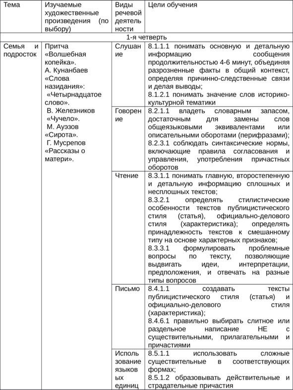 Содержание учебной программы по русскому языку и литературе организовано по разделам обучения, включающим виды речевой деятельности и использование языковых единиц. Разделы разбиты на подразделы, которые содержат в себе цели обучения по классам в виде ожидаемых результатов [1, с.10]. Каждая четверть содержит два раздела, после изучения которых выполняется суммативная работа за раздел (СОР), а в конце четверти ученики выполняют суммативную работу за четверть (СОЧ). Задания, представленные в проверочных работах, ориентированы на проверку целей обучения, обозначенных в Программе. Так, например, в 8 классе в 1 четверти предлагается для изучения раздел «Семья и подросток», включающий в себя цели обучения по видам речевой деятельности. Для наглядности привожу фрагмент Долгосрочного плана по предмету «Русский язык и литература» для 8 класса с нерусским языком обучения [1, с.50].