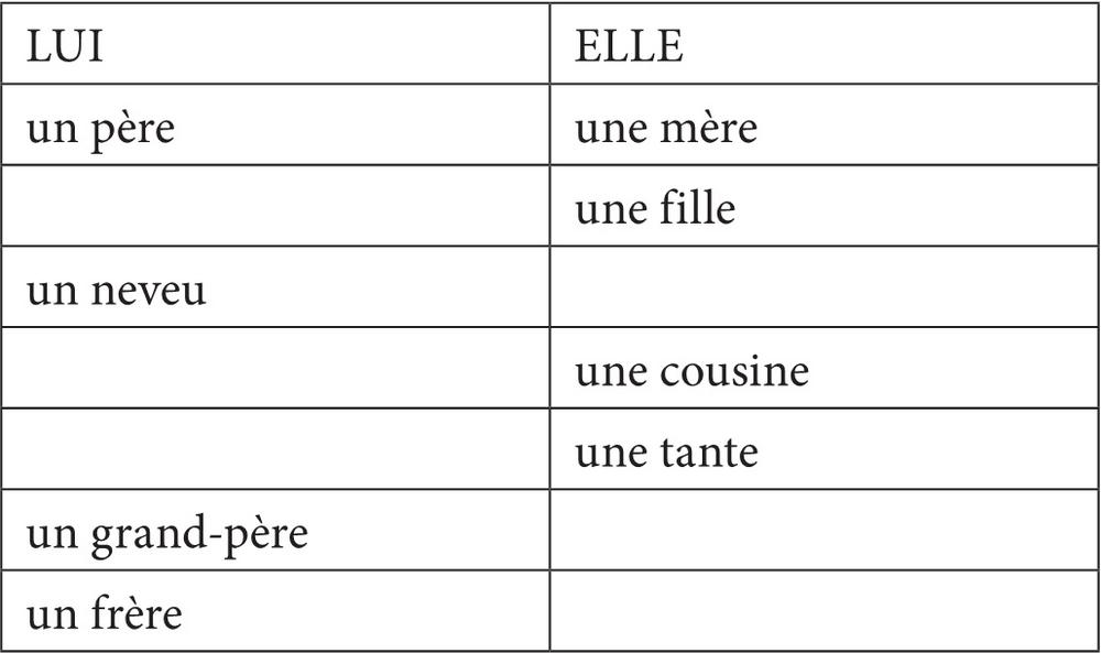 A. Complète larbre généalogique dAlexandre avec les mots qui manquent.