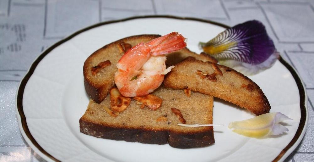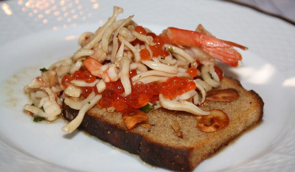 По 200 гр кальмаров и отварных, замороженных креветок, по 1 столовой ложке красной икры, соевого соуса и рубленой зелени базилика, по 2 столовые ложки растительного масла и полусладкого вина, 1 чайная ложка сока лимона, 1 зубчик чеснока, по щепотке карри и молотого имбиря, 4-5 готовых крутонов (рецепт приведен в этом разделе).