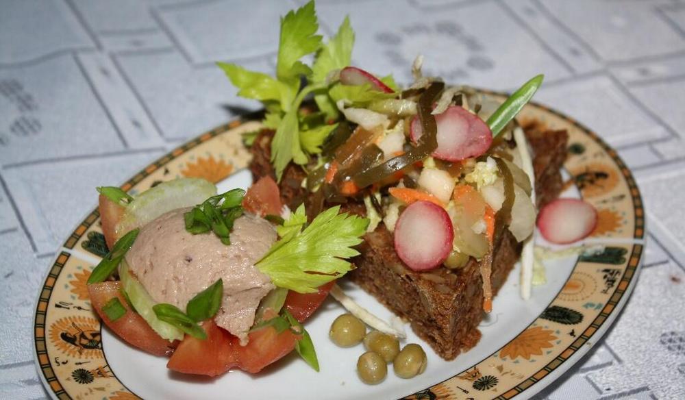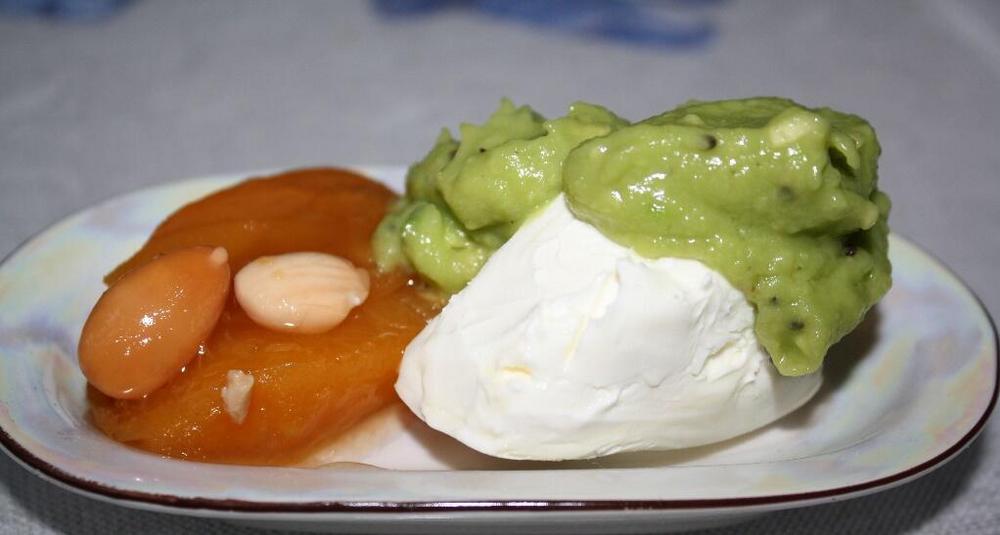 Или сыр можно подать под пастой из авокадо и киви. Гарнировать густым вареньем из абрикосов.