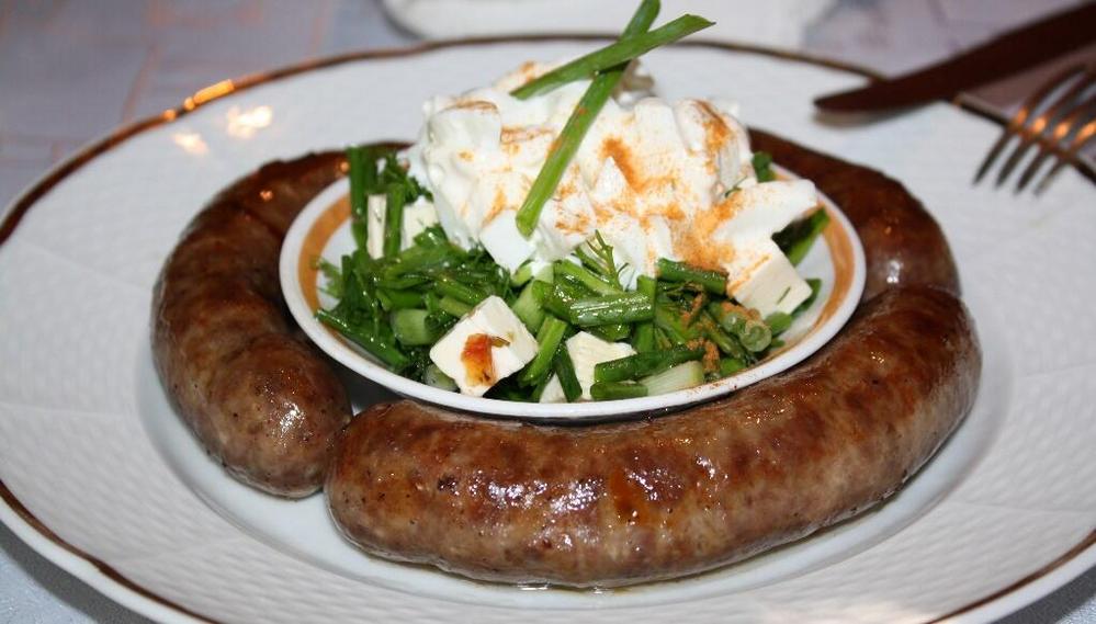 3-4 стебля зеленого лука, по 100 гр сыра Фитаки (в масле) и сметаны, 2-3 отварные яйца, по щепотке молотого перца чили и паприки, соль по вкусу.