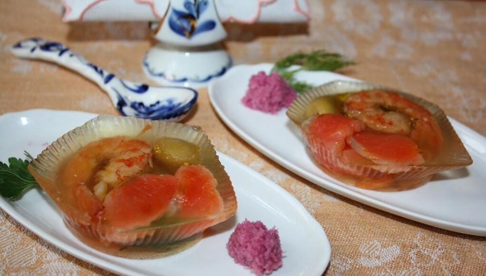Рыбу нарезать тонкими полосками. Рыбу и креветки разложить в невысокие формочки (лучше силиконовые), оформить оливками и зеленью, залить теплым желе. Остудить желе до комнатной температуры и оставить в холодильнике на несколько часов до полного застывания бульона.